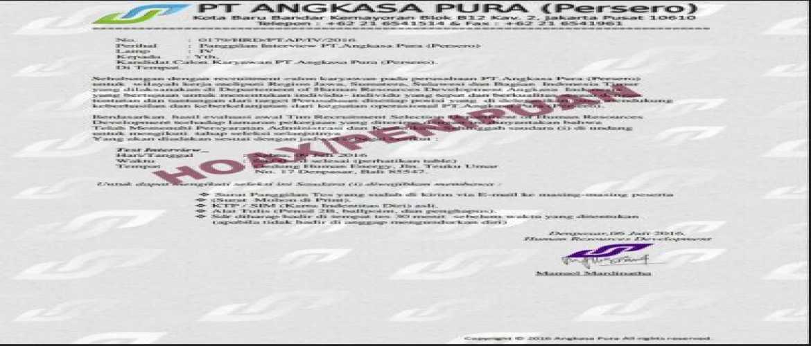 Untuk itu, PT Angkasa Pura I (Persero) mengingatkan agar masyarakat tidak mempercayai pengumuman lowongan kerja seperti itu. Pengumuman rekrutmen PT Angkasa Pura I (Persero) diumumkan melalui media massa nasional dan website korporat diwww.angkasapura1.co.id/info-rekrutmen. PTAngkasa Pura I (Persero) akan menindak tegas segala bentuk penipuan yang mengatasnamakan perusahaan. Masyarakat dimohon agar selalu waspada, melakukan konfirmasi, atau melaporkan segala bentuk indikasi penipuan melalui e-mail:humas@ap1.co.id, nomor telepon 021-6541961 ext.2537 (contact person: Dadang Jaka Ruliawan/Career & Talent Department), atau melalui contact center Bandara172 di nomor telepon 172.